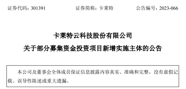 12月5日,卡莱特云科技股份有限公司(以下简称“卡莱特”)发布公告称,公司于2023年12月4日召开第一届董事会第二十五次会议和第一届监事会第二十一次会议,审议通过了《关于部分募集资金投资项目新增实施主体的议案》,同意公司新增全资子公司深圳市同尔智造有限公司(以下简称“同尔智造”)为募集资金投资项目“LED显示屏控制系统及视频处理设备扩产项目”实施主体,与公司共同实施该募投项目。公司将根据实际资金需求,在该项目的各个实施主体之间进行资金调配尊龙凯时 - 人生就是搏!-z6com。