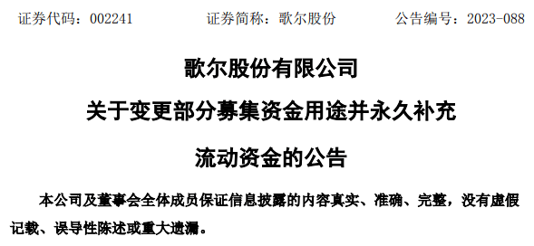 12月6日尊龙凯时·(中国区)人生就是搏!,歌尔股份有限公司(以下简称“歌尔股份”)发布公告:公司于2023年12月5日召开第六届董事会第 十一次会议及第六届监事会第十次会议,审议通过了《关于变更部分募集资金用途并永久补充流动资金的议案》尊龙凯时Z6AG·尊龙凯时,同意公司根据整体业务发展规划和实际经营情况, 充分考虑外部经济和产业发展状况,科学审慎地规划资源投入规模和投入节奏尊龙凯时·(中国区)人生就是搏!,提高募集资金使用效率,将原计划用于“青岛研发中心项目”的剩余募集资金53,638.45 万元永久补充流动资金,用于公司日常生产经营及业务发展人生就是博z6com。